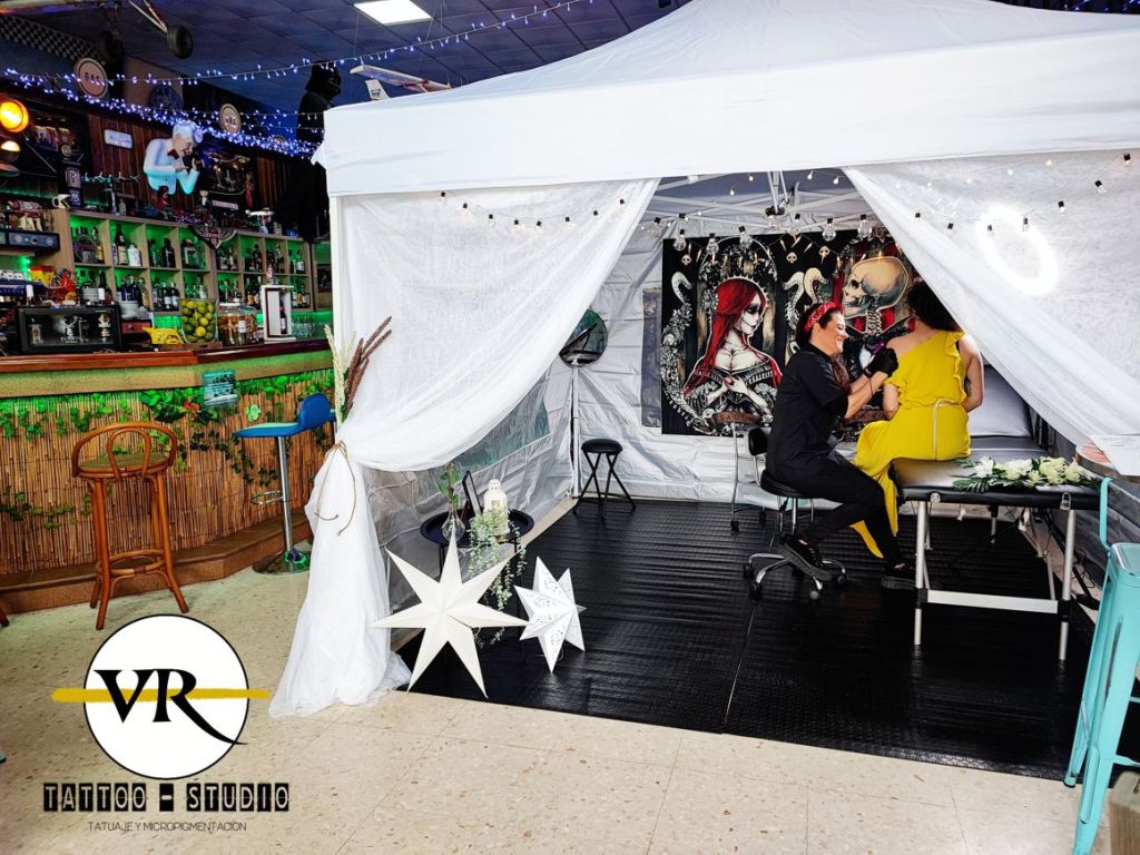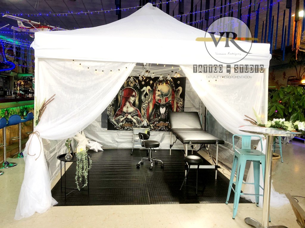 Para los más clásicos: Carpa tattoo-studio, con suelo de caucho para garantizar un trabajo limpio e higiénico, con decoración especial bodas, dando así una imagen rompedora y elegante para este día tan especial.